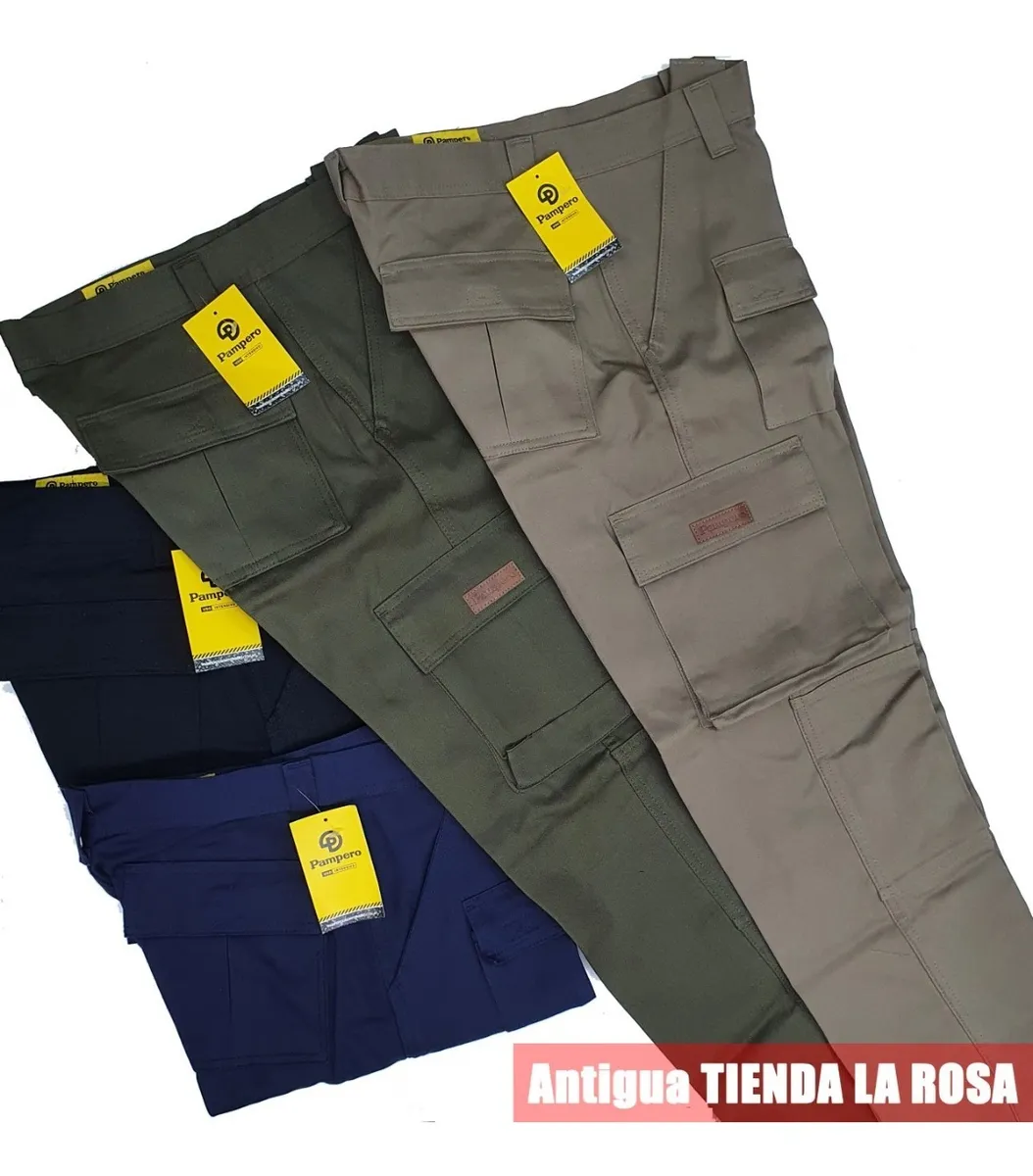 Pantalon Pampero Cargo CON REFUERZOS BOLSILLOS CON TAPA Y VELCRO BOLSILLO DELANTERO EXTRA RECORTE EN TRASERO Y PIERNAS CARTERA CON CIERRE. Colores Azul, Beige, Verde y Negro TALLES 38 AL 54 Tejido Gabardina